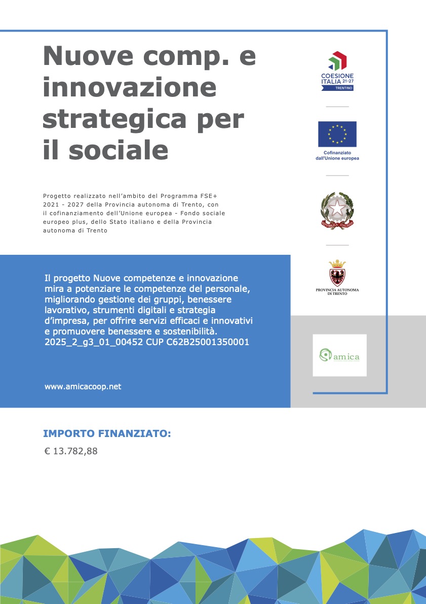 AM.IC.A. s.c.s. nel corso del 2025 fino a fine estate 2026, sta partecipando al progetto formativo Nuove competenze e innovazione strategica per il sociale, realizzato nell’ambito del programma FSE+ 2021-2027 della Provincia Autonoma di Trento, grazie al cofinanziamento dell’UE, del Fondo Sociale Europeo Plus, dello Stato Italiano e della PAT. L’obiettivo del percorso è fornire ai nostri dipendenti nuove competenze, migliorando la capacità di gestione dei gruppi, il benessere lavorativo, l’utilizzo di strumenti digitali e la strategia d’impresa, per offrire sempre di più servizi efficaci ed innovativi e promuovere il benessere e la sostenibilità dei nostri interventi per la comunità